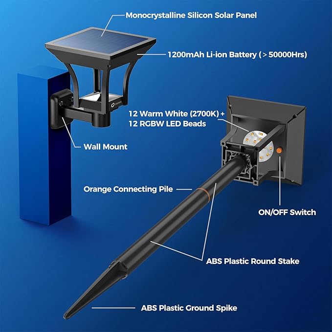 CINOTON RGBW Solar Landscape Pathway Outdoor Lights with 3 Lighting Modes, IP65 Waterproof LED Solar Powered Wall Lights for Garden Yard Lawn Path Driveway Pool Backyard Warm White & Multicolor 4 Pack