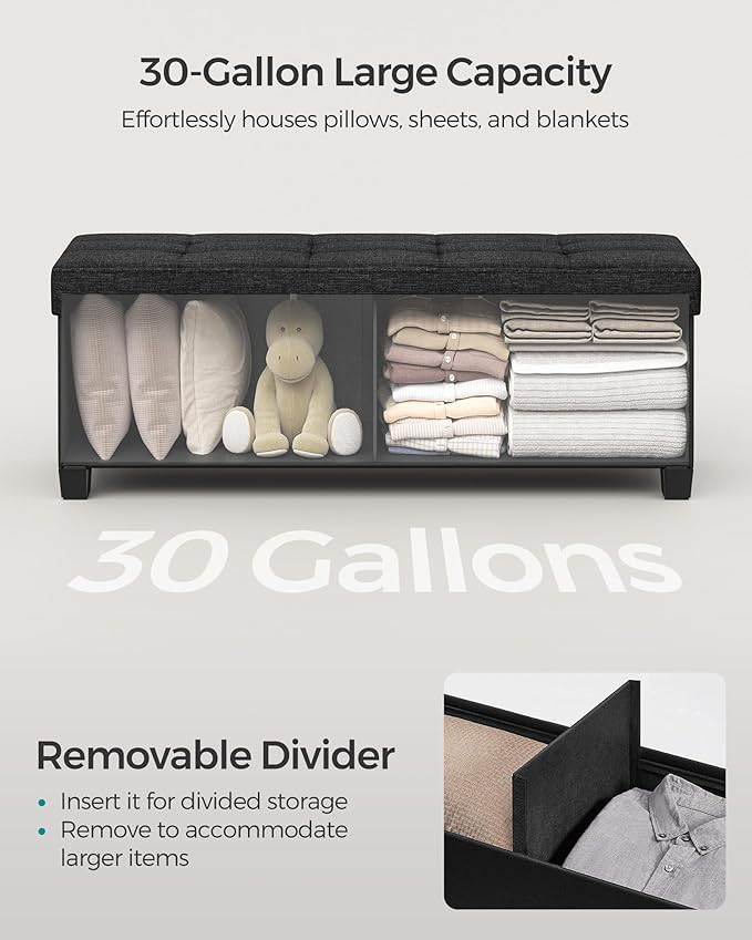 - 【SPACIOUS STORAGE】Sized at 15"D x 43"W x 15.7"H (38 x 110 x 40 cm), this end of bed bench offers a 30-gallon (112 L) volume for your blankets, books, and bed sheets. A removable divider is included to keep you items neatly sorted