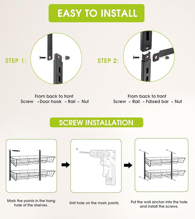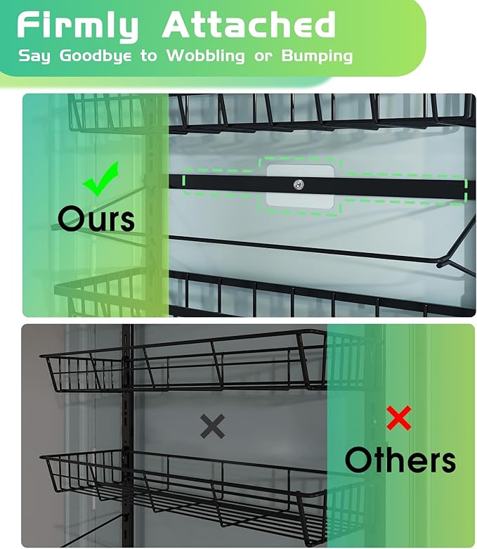 - Adjustable & Wall-Mounted: This Over The Door Organizer Pantry Organizer can be adjusted to accommodate items of different heights. You can easily nail this rack to your wall or door for a secure and sturdy fit. The rack also features 6 flexible hooks and 4 adhesive stickers, which help to prevent swinging when opening and closing doors. The full basket design also ensures that your items won't slide off the back of the rack.
