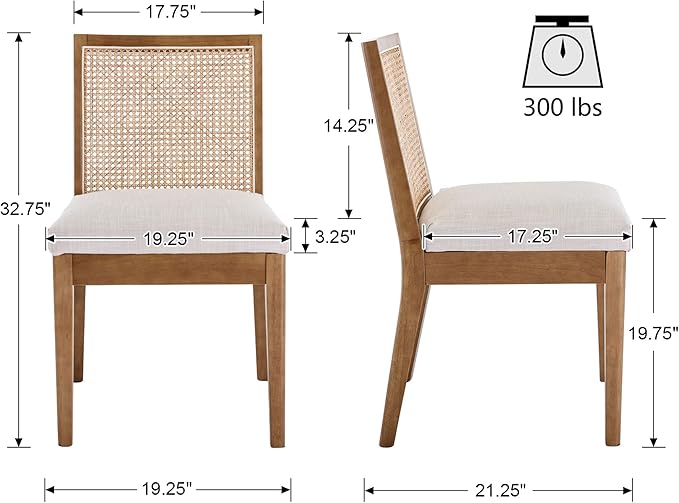 - UPHOLSTERED SEAT These padded dining chairs have a 19.25" W upholstered seat cushion and a 14.25" H x 17.75" W square rattan back, the soft cushion seat allows you to sit more comfortably