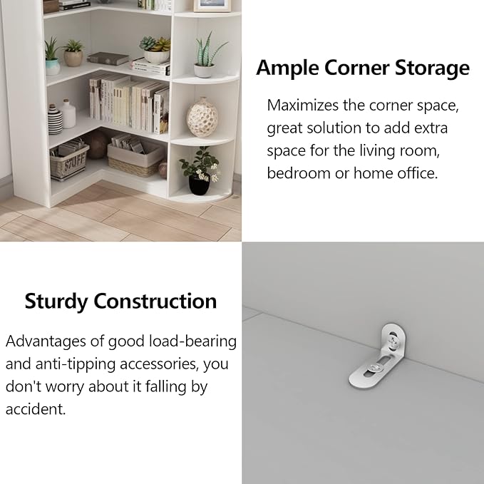 - 【High-caliber Quality & Sturdy Construction】This Loomie White Corner Book Shelf is made from durable commercial grade laminate that will withstand all the daily stress that is thrown at it through the years, ensuring a consistent chic, minimalist look. Loomie Corner Book Shelf is a safe purchase when it comes to quality. Each shelf can hold up to 80 lbs. Anti-tipping kits, reinforced hardwares and full baffle improve the stability and security. You don't worry about it falling by accident. Overall, it will get the storage or display job done and look good doing it. It's a perfect size bookshelf for every home corner space.