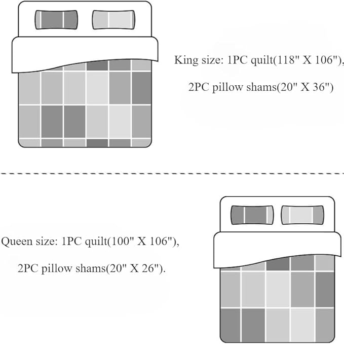 - Package Included Queen: 1PC Quilt(100" X 106") 2PC Pillow Shams(20" X 26") OR King: 1PC Quilt(118" X 106") 2PC Pillow Shams(20" X 36")