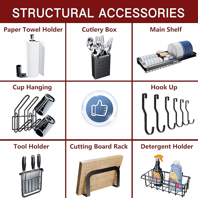 - STAINLESS STEEL MATERIAL: made of stainless steel, totally strong and sturdy, enoughthis over the sink dish rack is durable enough for long term use. Besides, its large capacity allows you to store all the tableware, while the over-the-sink design enables it to drain water directly into the sink, not onto the countertop, effectively avoiding water pooling. (Some Accessories Have a Protective Film On the Surface, Please Tear It Off Before Use.)