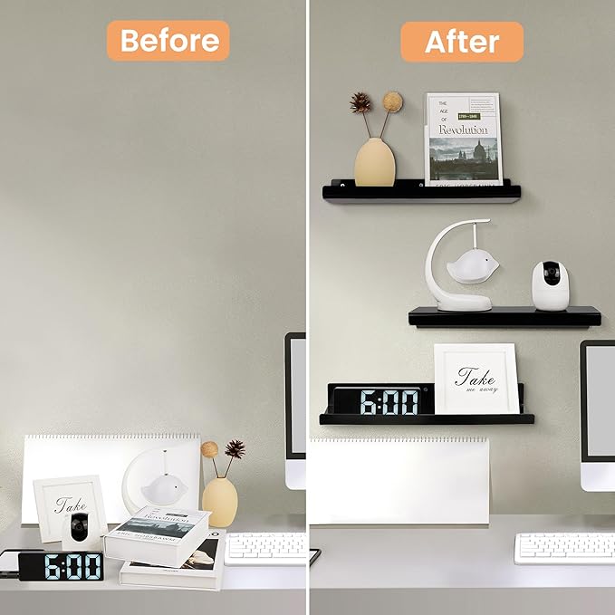 - 【UNIQUE WALL DECOR】Classic black floating shelf with simple shiny appearance looks great and brings extremely beauty whether it is placed in rows or staggered, which fits any home decor. You can use them in many places: bathroom, bedroom, living room, wherever.