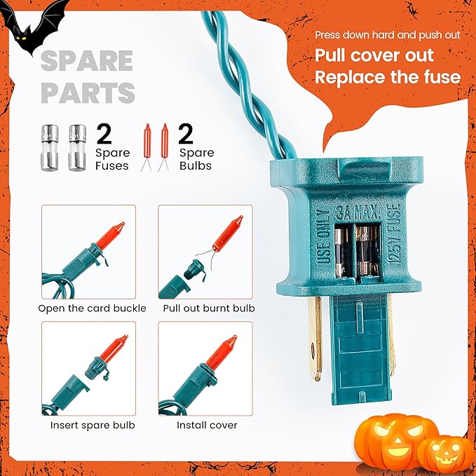 - 🎃Unique Design incandescent mini Lights: The bulb has a snap-on design and is very easy to replace. When one of our bulbs breaks, it doesn't affect the other bulbs. This is a very special design. You can replace damaged bulbs individually with the spare bulb or fuse provided by us.