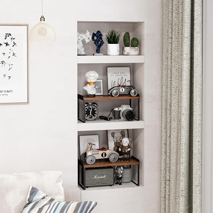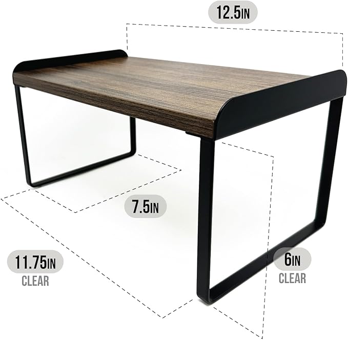 Mitus Shelf Organizer and Storage, Tiered Wood Cabinet Rack for The Kitchen Counter, Bathroom Counter, Pantry Cupboard, Office Desk Bookshelf, 12" Wide Walnut Brown and Black