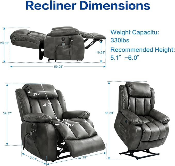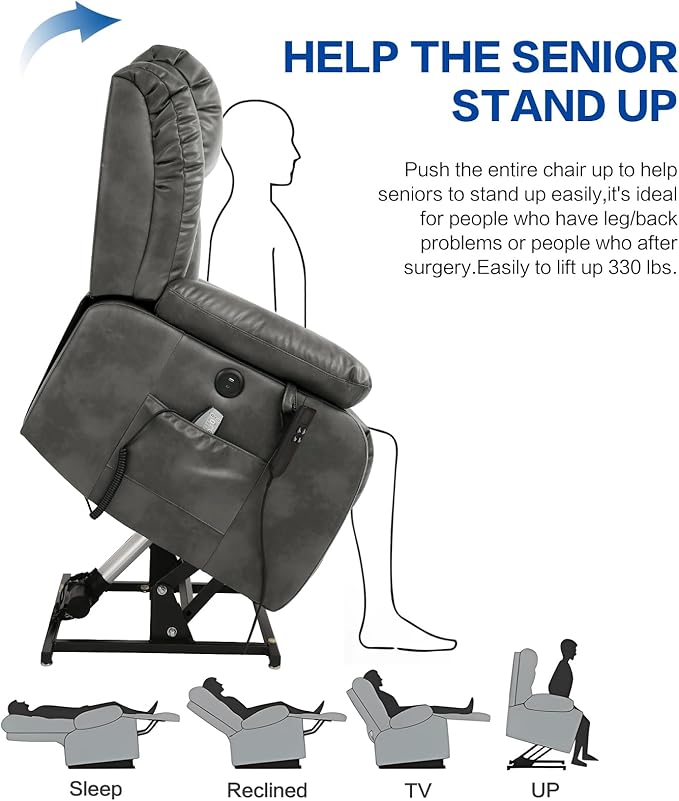 - 【Heating and Massage】The lift chair has eight massage points; three massage modes, the waist has a heating system that can provide waist care and heating for the elderly or other people in need; at the same time, the temperature-controlled heating system, 113℉~140℉, when it reaches 140℉, it will automatically cut off the power and continue to cool down to 113℉ before heating.