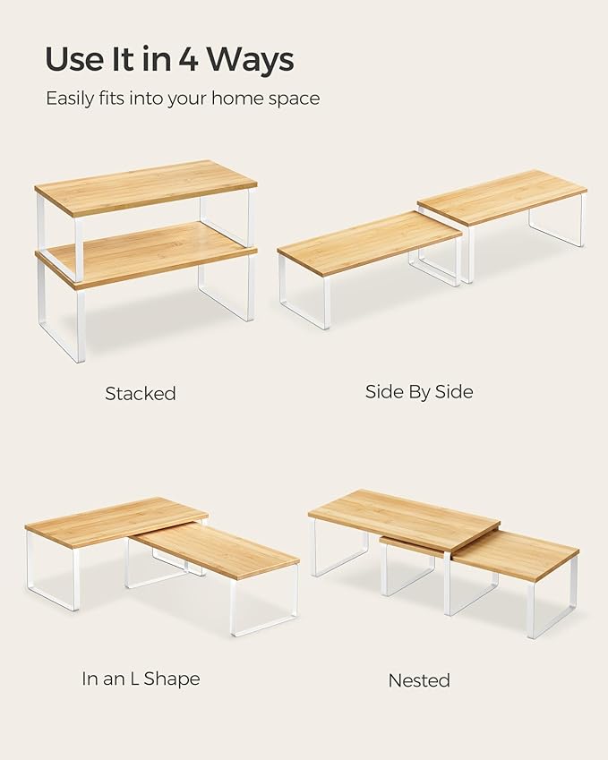 - [Adjustable] With their unique design, with one slightly smaller than the other, these shelf organizers can be stacked on top of one another, nested, used separately, or even in an L-shape. Adjust them how you want to perfectly fit your kitchen space