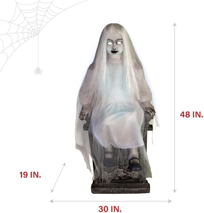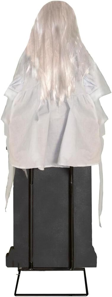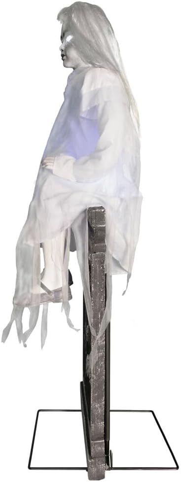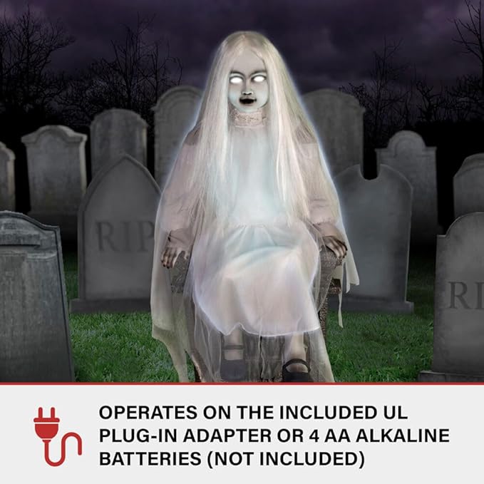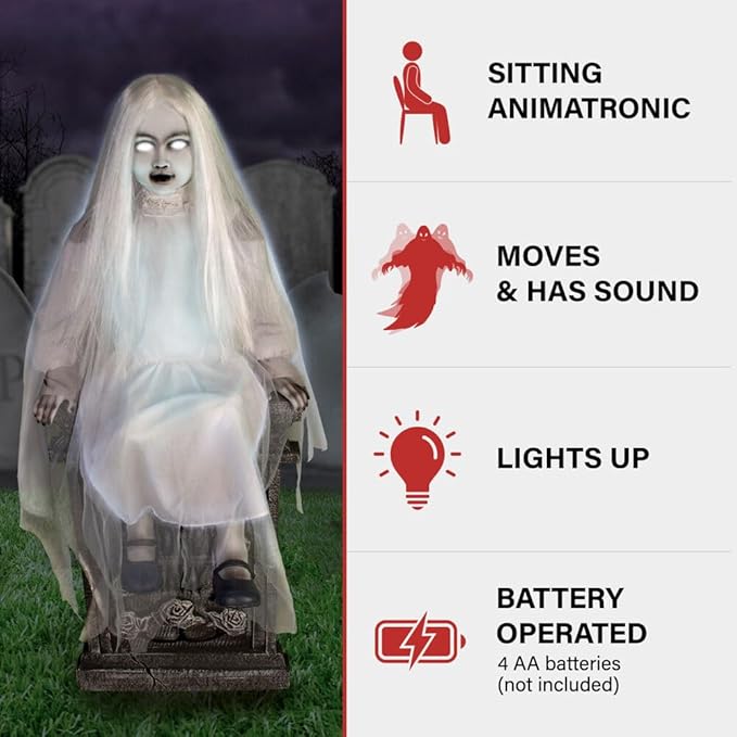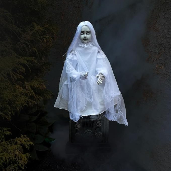 - Premium Life-Size Animatronic: Darcy, the sitting tombstone girl, will terrify your trick-or-treaters as she sits on a headstone, trapped between the living and the dead; Spine-tingling animation includes talking, humming, giggling, haunting sound effects, moving head, and swinging legs