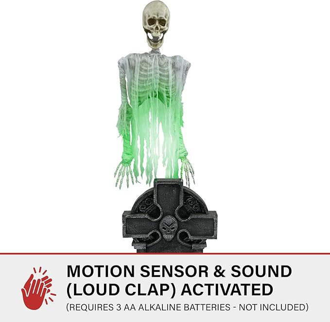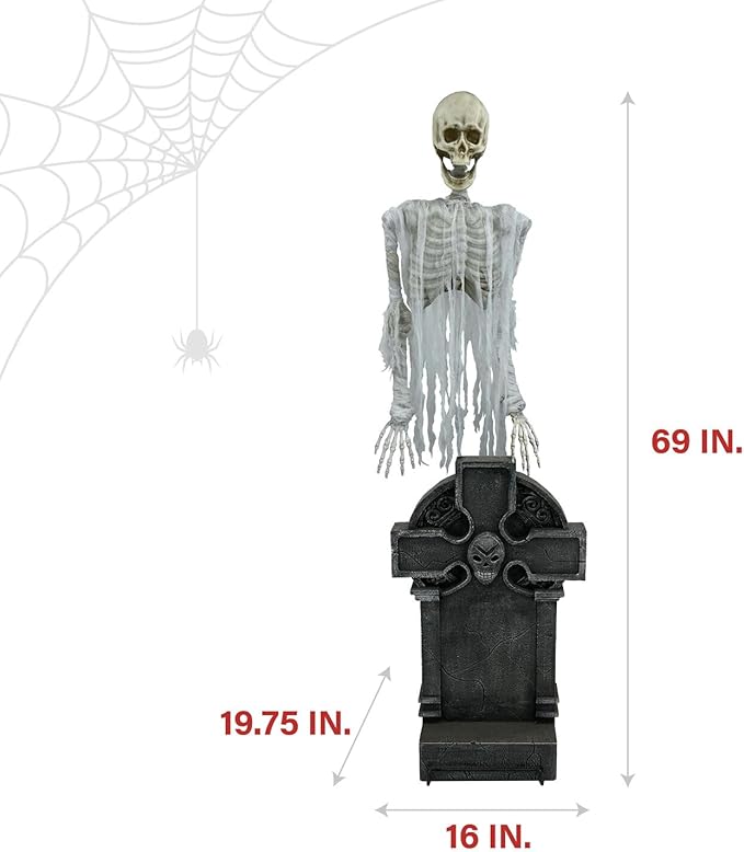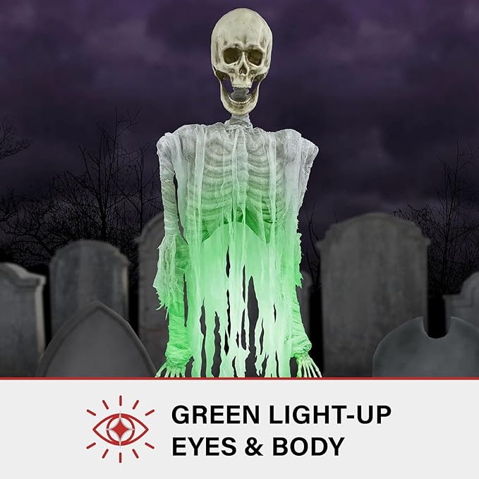 - Sound and Lights: Green LED light illuminates from the tombstone onto the skeleton ghost while a haunting soundtrack plays in the background, creating a bone-chilling display; The skeleton's white fabric moves with the wind for the finishing touch