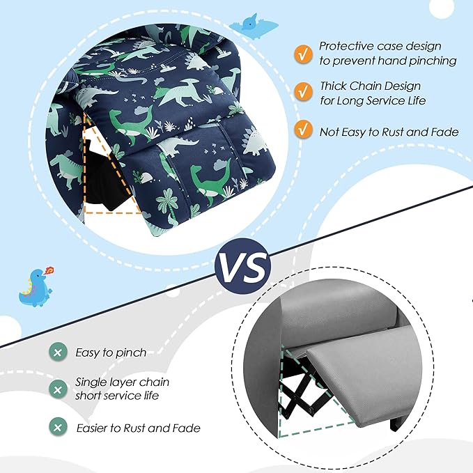 - Sturdy Construction & Safe Design: This kids recliner chair is made of solid wood and iron frames, can be used for a long time. 4 anti-slip and scratch-resistant feet prevent the chair from accidental sliding, the protective cover of the bottom chain can prevent children from accidentally getting pinched, ensuring the safety of the child chair.