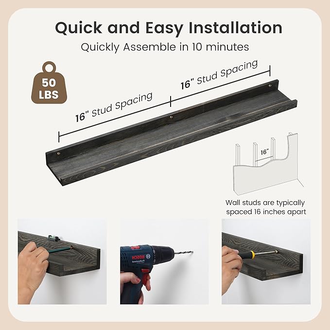 - Easy to Install: You will get a level, screws for the wall, drywall anchors, a detailed installation guide, and two beautiful hand-crafted solid pine wood shelves. With the level, you can make sure your picture ledge shelves are well aligned. Just follow the simple instruction to install the hanging shelves for wall decor within 10 minutes. We add additional screw and anchor to the hardware bag just in case. If you have any questions about our products, please feel free to contact us