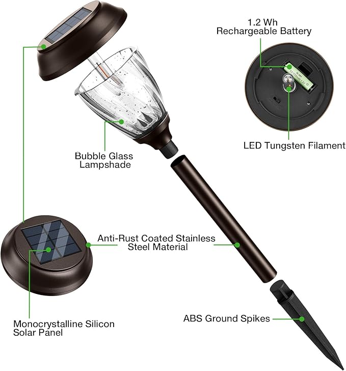 - Luxury Solar Lights with Crystal-Clear Durability - Featuring bubble-textured glass (93% light transmittance) and nano-coating for 96% easier cleaning, combined with 99.6% UV stability (5+ years) to resist yellowing. Superior Long-Term Light Transmittance Glass retains 80%+ clarity for 2 years (vs plastic’s 5%), while scratch-resistant design elevates modern decor and FDA-compliant storage solutions. Energy-efficient 100% light diffusion reduces waste, perfect for sustainable home landscapes.