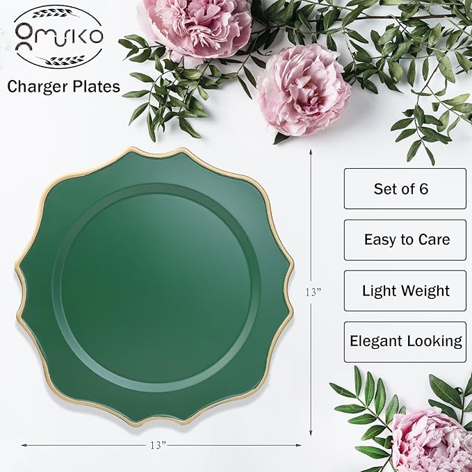 Green Chargers for Dinner Plates, 13 Inch Scalloped Plastic Decorative Table Charger Service Plates Set of 6 for Wedding, Holiday, Thanksgivng, Christmas