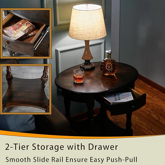 MODERION Oval End Table with Drawer, Solid Wood Sofa Side Table with Storage Shelf, Traditional Living Room Corner Table, Nightstand, Easy Assembly 28” x 22” x 24” Retro Walnut CJZ2233DC