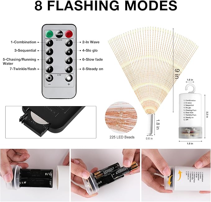 - 8 Modes Hanging Fairy String Lights with Remote: There are 4pack christmas lights with remote,effective receiving range is 10-15 meter.Support range remote control to control 8 different modes (Combination, In wave, Sequential, Slo glo, Chasing/Flash, Slow fade, Twinkle/Flash, Steady on).To avoid forgetting to turn off the string lights, you can set timer by pressing the TIMER button, the timed fairy Lights can be set to automatically turn on for 6 hours and turn off for 18hours