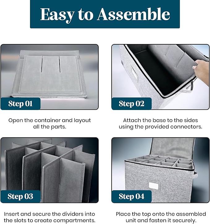 - QUALITY MATERIAL WITH HARD SHELL PROTECTION: Crafted from quality materials, this storage organizer features a hard-shell design, boasting sturdy, non-slip textured top, bottom, and sides. Its fully padded interior ensures added protection while storing, transporting, or moving delicate china dishes. This stemware storage box includes a label holder to easily identify contents and a double zippered closure to provide protection from dust and breakage.