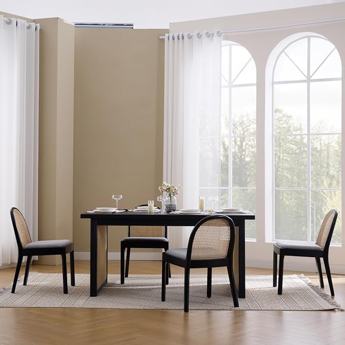 Mid Century Dining Chairs Set of 6, Accent Rattan Side Chairs Linen Fabric Kitchen Chair with Solid Wooden Legs for Living Room Dining Room, Grey