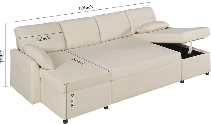 VanAcc Sleeper Sofa, 110 inch Oversize - 2 in 1 Pull Out Bed, Sectional Sleeper Sofa with Double Storage Chaise for Living Room, Beige Chenille Couch