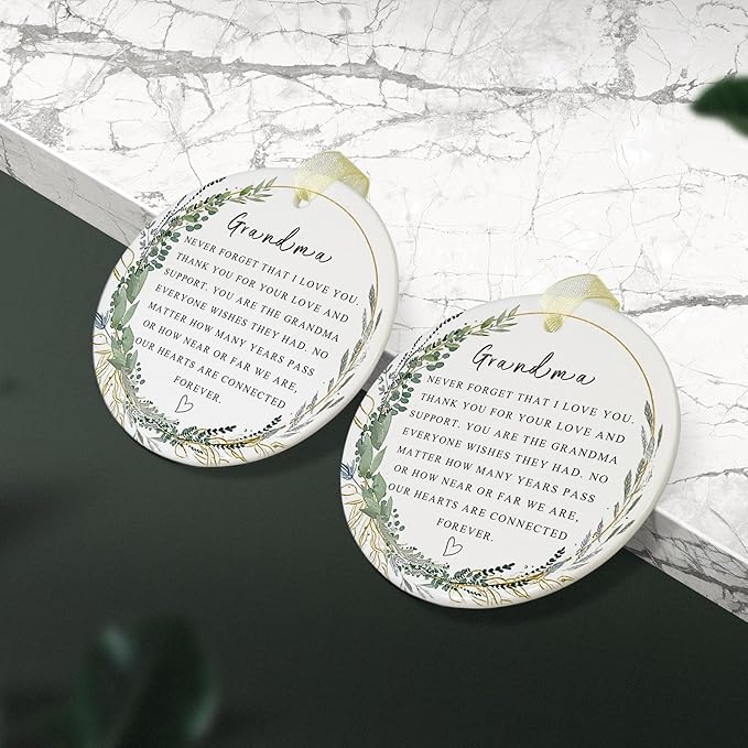 - 🌼【Perfect and delicate size】This is a grandma memory ornament with a diameter of 2.9 inches and a thickness of only 0.18 inches. The product includes: a round grandma ornamentt*1, a gift box*1 and a lanyard*1. The gift box comes with it makes it easy for you to give the best grandma ever gifts directly to family and friends and other special people in your life, and the lanyard that comes with it helps to hang it easily on the Christmas tree or anywhere you want.