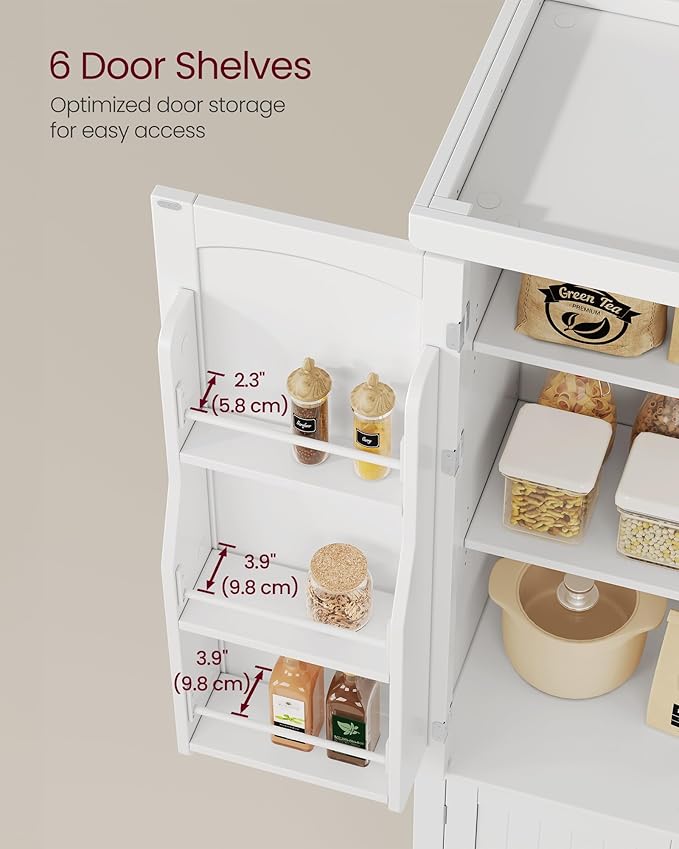 - [Huge Storage Capacity] Boasting 2 large cabinets and 6 door shelves, this spacious pantry fits everything from your food and dinnerware to kitchen appliances, tidying up wherever you set it