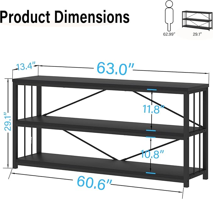 LVB Black Entryway Table, Modern Narrow Console for Hallway, Industrial Farmhouse Foyer Table with Storage Shelves, 63 Inch
