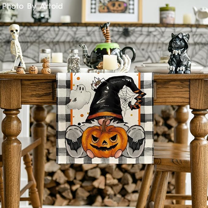 Artoid Mode Buffalo Plaid Gnome Bat Pumpkin Ghost Halloween Table Runner, Sensonal Kitchen Dining Table Decor for Home Party 13x90 Inch