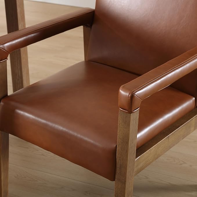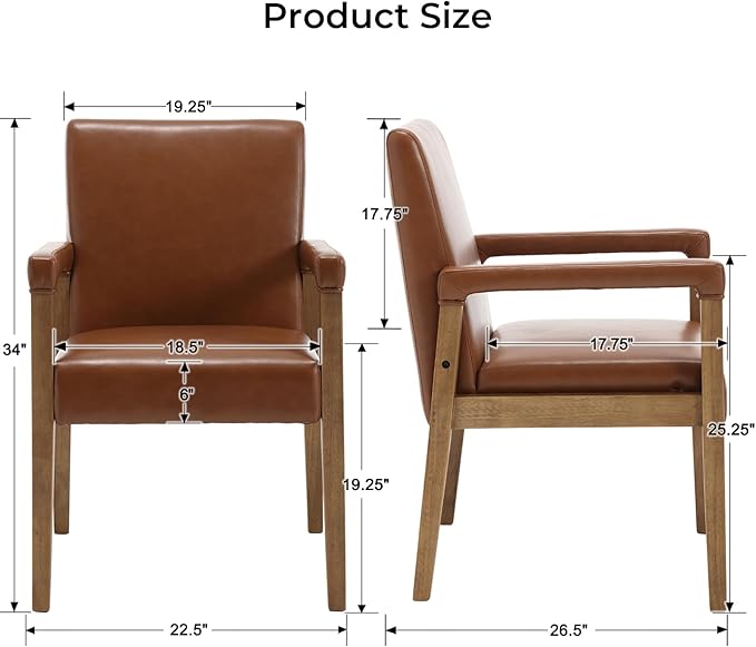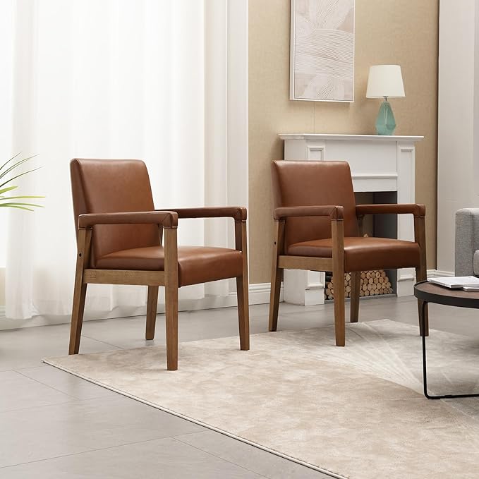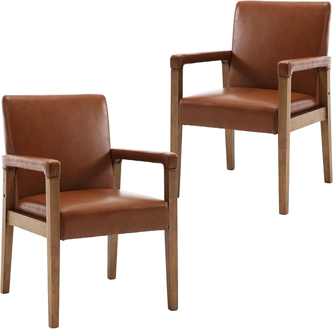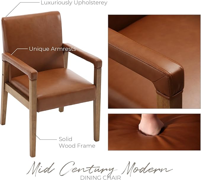 Mid Century Modern Dining Chairs Set of 2 Faux Leather Upholstered Living Room Side Chair, Kitchen Arm Chair with Solid Wood Legs for Home Kitchen & Restaurant, PU Brown