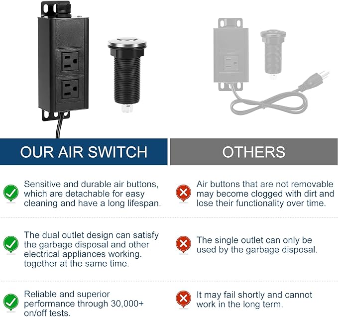 - Wide Compatibility: The air switch button is 3.58” long, which fits any stainless steel sinktop and thicker countertops, like marble, quartz and granite, much wider applicable than those short 2.5” ones for stainless steel countertop only.It perfect fit for most brand or model of garbage disposers(≤2.5HP).