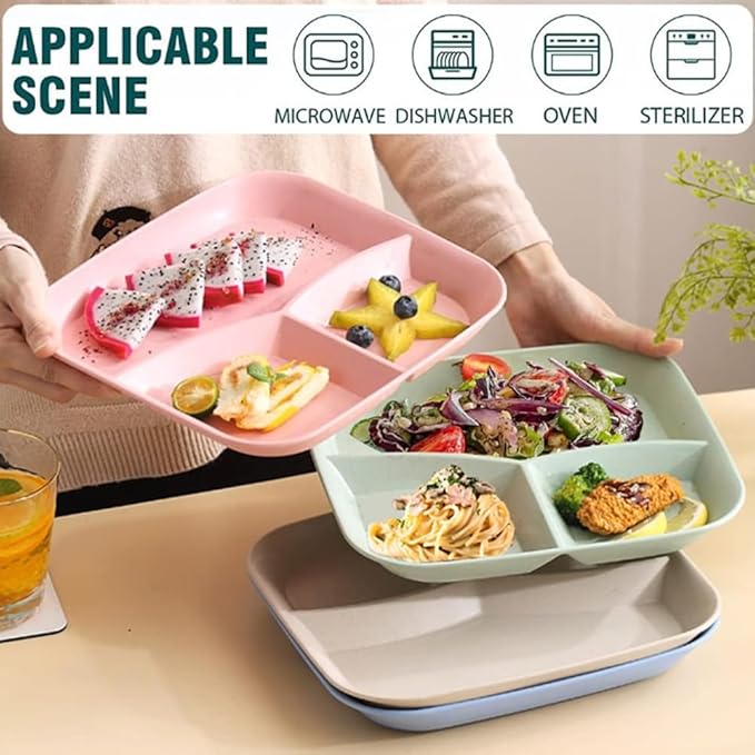 - Package Size: 4 colors (Green divided plates, Beige divided plates, Blue divided plates, Pink divided plates), size: 10 inches * 8.86 inches * 0.8 inches.