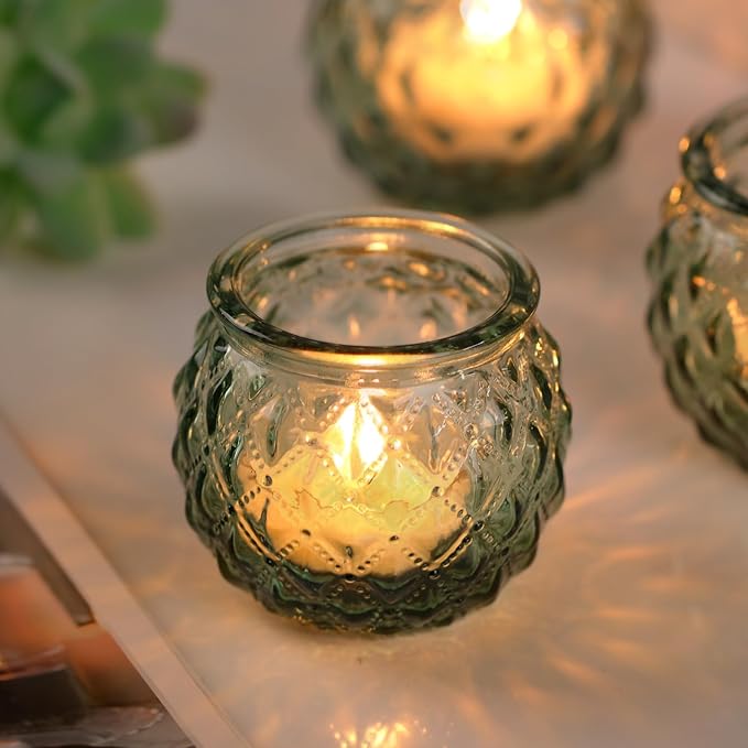 - ❤️❤️[ Votive Candle Holders Set ]❤️❤️: You will get 24 pack green votive candle holders in your package, measuring 2.1ʺ diameter and 2.1ʺ height approximately, can be used with tea light candle, and flameless LED tea waxes less than 1.2" in diameter.(Candles Excluded). These glass votive candle holders make a nice addition to every tablesetting, the glass reflects the light from the candle in such a pretty way, creating a warm and inviting ambiance that enhances the dining experience.