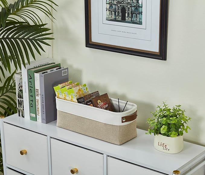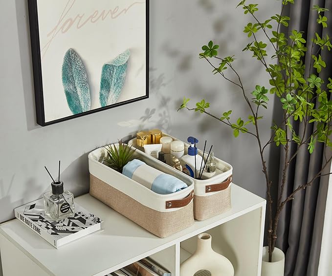 DECOMOMO Narrow Storage Bins Small Baskets for Organizing Bathroom, Toilet Tank, Towel Storage, Entryway, Gifts (Beige and White - Set of 4)