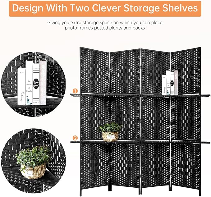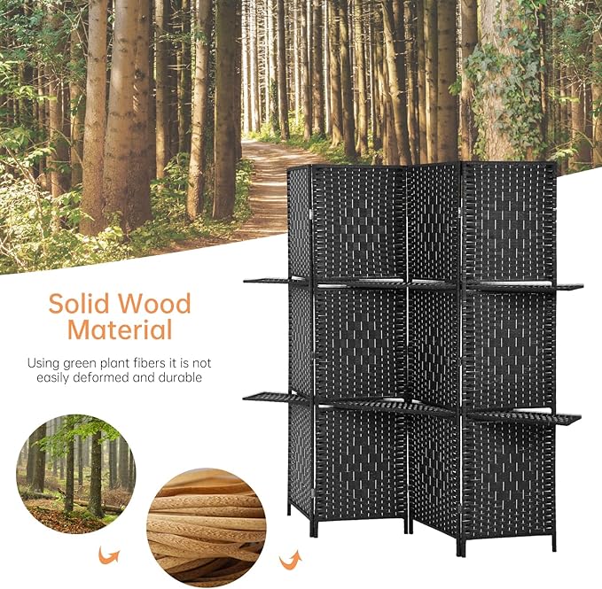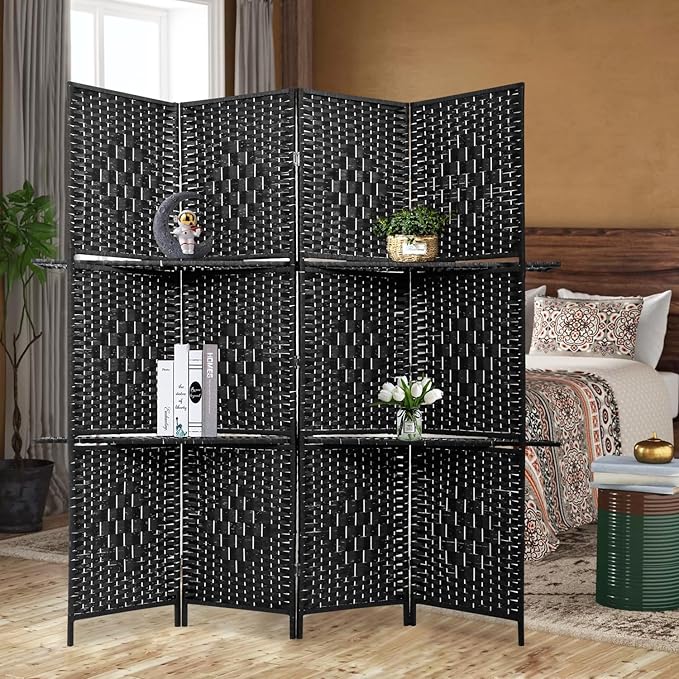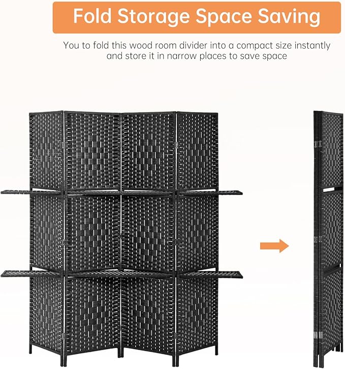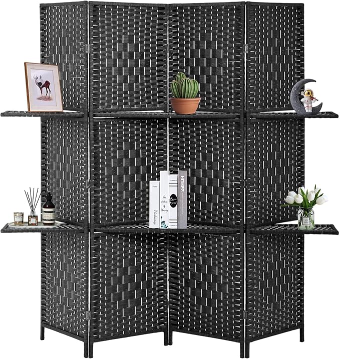 PayLessHere Room Divider Room Screen Divider Wooden Screen Folding Portable Partition Screen Wood with Removable Storage Shelves (Black, 4 Panel)