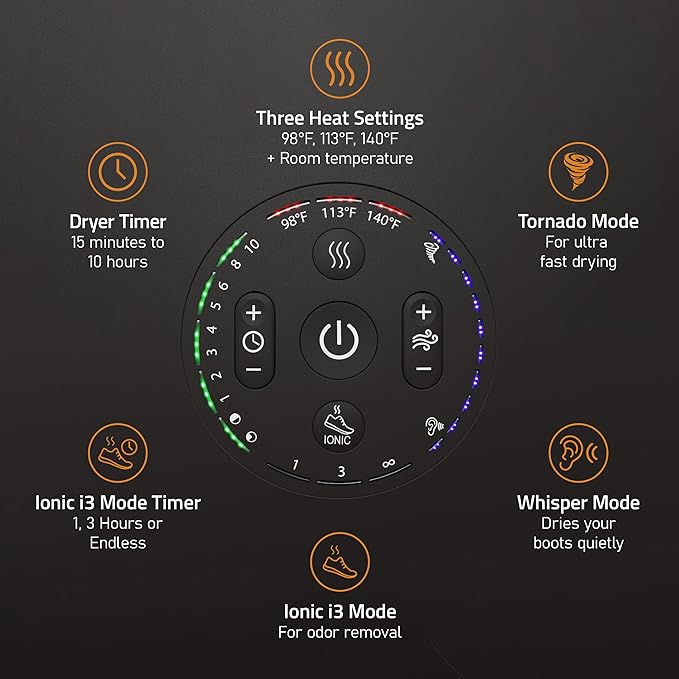 - Unmatched Turbocharged Efficiency - Experience the power of our patented turbine technology up to 5 times faster than a similar shoes dryer. With Tornado Mode, the fastest drying setting, you can swiftly conquer wetness, whether you're a busy parent, an outdoor enthusiast, or anyone on the go