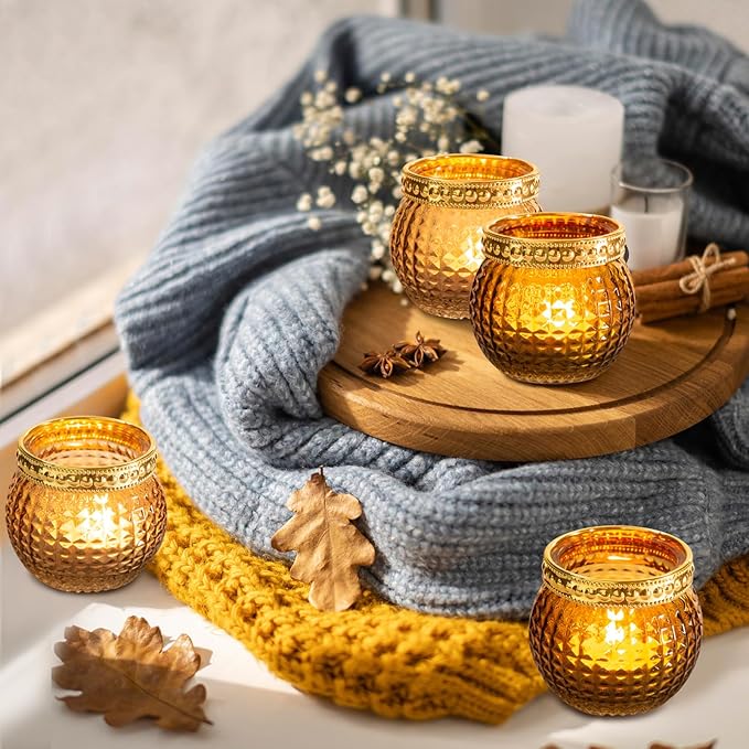 - Amber Votives for Tea lights: Each glass candle holder size of 2.6 inches x 2.32 inches, fits tea lights perfectly. The votives are well packaged for arrived in good condition. Please note that tea lights or candles are not included.
