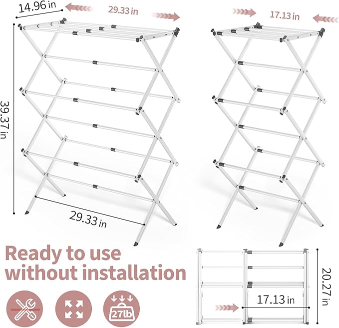 - Expandable Design: The 3-tier laundry drying rack features 11 steel drying rods that can be extended from 17.13 to 29.33 inches in length, providing ample drying space for towels, clothes, sweaters, and more.