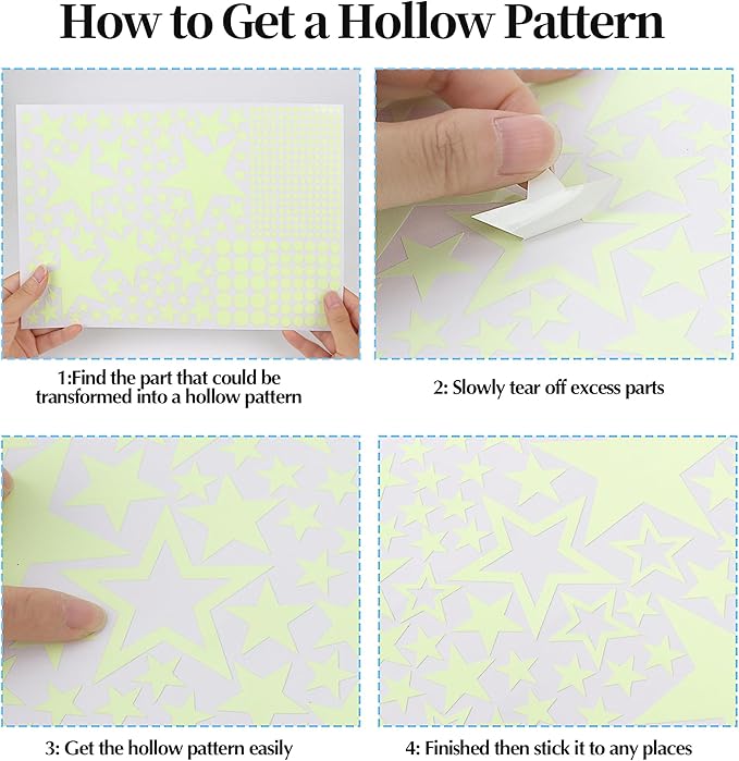- Quality Luminous Material,Peel and Stick,Easy to Apply : The glow in the dark stars are made of high quality vinyl and luminous materials,nice and thick, waterproof.These stickers come with powerful backing adhesion,very easy to install,just peel-stick-install.The glow space wall decals can cling strongly to any surfaces for years.Also they are extremely easy to remove and reposition,but never hurt your wall and leave no residues when you don't want it