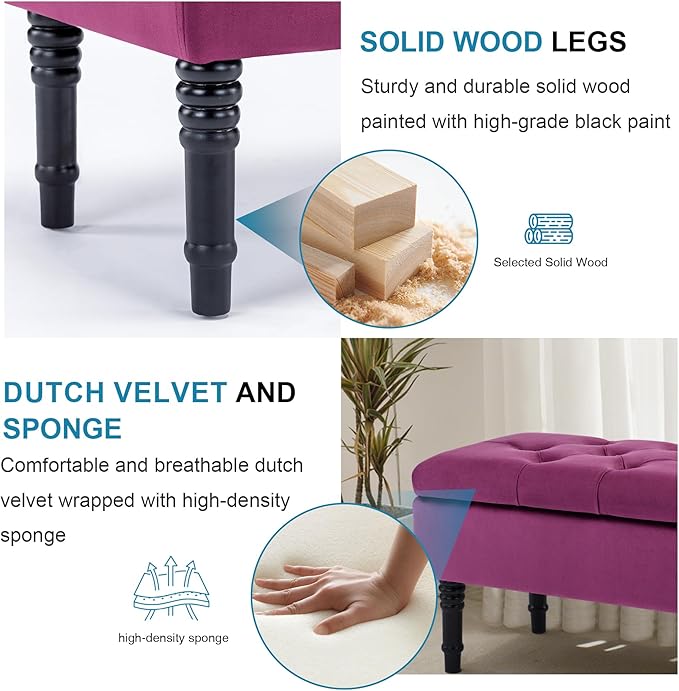 - Premium Materials: This bench is made of skin-friendly velvet, soft and comfortable to the touch. The seat cushion of the storage bench is equipped with high-density sponge, which is not easy to deform after sitting for a long time, allowing you to experience a comfortable sitting experience.