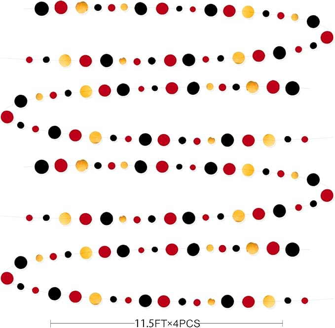 - 🔴PACKAGE CONTAINS- 4 set of gold and black red circle dot party garland banner,each string is 11.5 feet/3.5 meters, Total is 14 meters/46 feet.