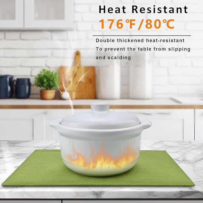 - Long-lasting - Faux linen material polyester fabric, they are a double layer of fairly thick and sturdy linen style placemats, well made the hemstitching is neat and even and there were no loose threads. These placemats are very hard-wearing, non-slip, no fading ,no staining and heat resistant, very safe to use. Size is 18x12 inch, hand cut, there may be 0.2inch error