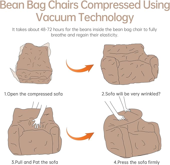 - Without Assembly Bean Bag Sofa: This comfy soft bean bag chair from us uses vacuum technology and the bean bag chair is already filled with memory foam so you don't have to refill the beans. When you receive the beanbag chair, just take it out of the box, cut off the plastic protective film, and then let it stand for about an hour, let the beans in the beanbag chair breathe freely and restore elasticity. You'll soon have a soft and comfortable beanbag sofa.