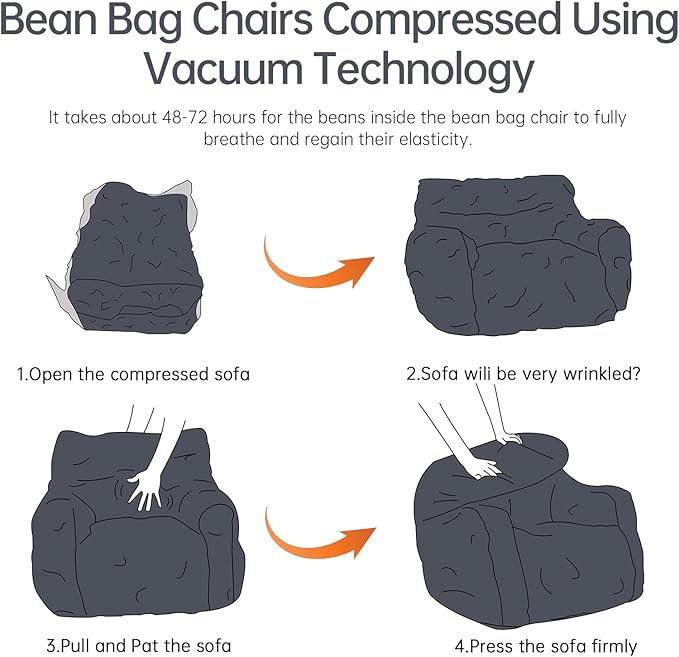 - Without Assembly Bean Bag Sofa: This comfy soft bean bag chair from us uses vacuum technology and the bean bag chair is already filled with memory foam so you don't have to refill the beans. When you receive the beanbag chair, just take it out of the box, cut off the plastic protective film, and then let it stand for about an hour, let the beans in the beanbag chair breathe freely and restore elasticity. You'll soon have a soft and comfortable beanbag sofa.