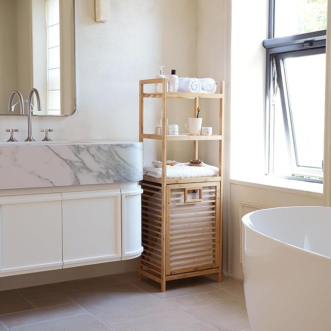 - 【Multifunctional Laundry】Featuring 2-in-1 design, three-tier storage shelves laundry hamper at the top provide ample space to store laundry supplies, toiletries or decor. Large capacity laundry basket at the bottom provides a large capacity for your clothes and towels.