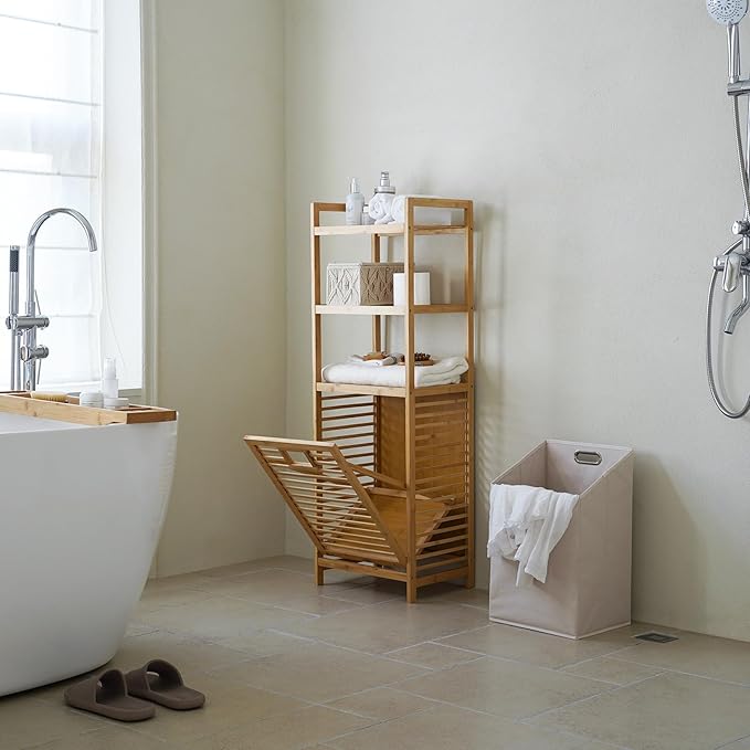 - 【Bamboo Laundry Hamper】Made from natural bamboo is both sustainable and practical, laundry basket with shelf is sturdy and durable, making it an ideal choice for families who are concerned about long-termism. Clothes hamper dimensions: 15.8"L x 11.8"W x 46.9"H.
