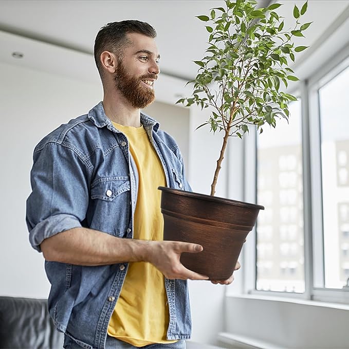- 【TRADITIONAL DESIGN】Plastic planters for indoor plants with trays are designed in in dark gold colors & a classic look, which allow this pot to fit into any indoor & outdoor setting. With these golded flower pots, it could adds fresh, decorative flair to your home. Decorate your windowsill, desktop, shelf, bedroom, living room, kitchen, garden, office with our 16 inch large plastic plant pot.