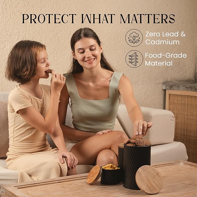 - Beauty Is in the Details – Elevate your style as you reduce stress. Your kitchen canister set delivers high-end quality with black galvanized metal and sleek acacia wood to complement any aesthetic.