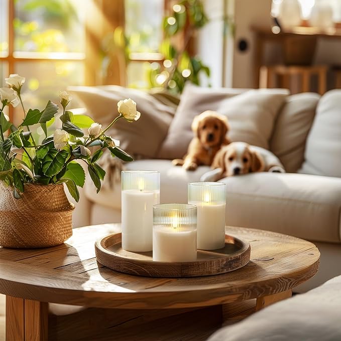 - Ribbed Glass Flameless Candles - Our battery candles are carefully crafted from real wax with unique ribbed glass shell. These electric candles look similar to traditional candles, but do not emit pungent odors and are safer