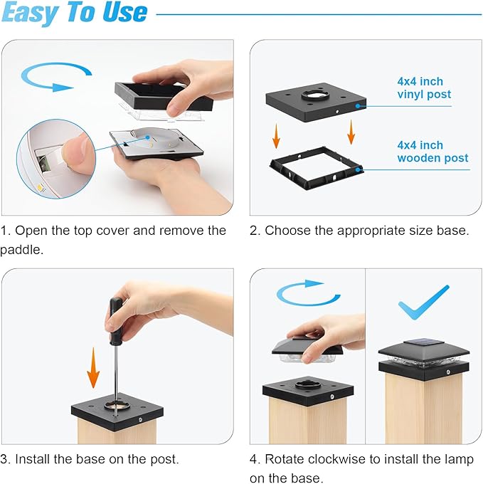 - 【Easy Installation】Each package contains 2 bases (4x4 wooden post and 4x4 vinyl post) and 12 screws. Choose the appropriate base size and place it on the corresponding post, then screw the two screws into the post through the small holes on both sides of the base. The solar fence post cap light is charged in sunlight for 6-8 hours during the day and automatically turns on for 10-12 hours at night