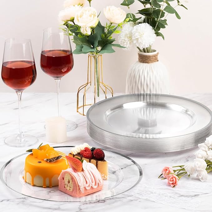 - ELEGANT AND STYLISH DESIGN - Clear charger plates with a silver rim feature an elegant and attractive design that enhances the decorative effect of the table layout, instantly attracting attention and creating a unique atmosphere. These chargers for dinner plates can also serve as decorative pieces to enhance your home.