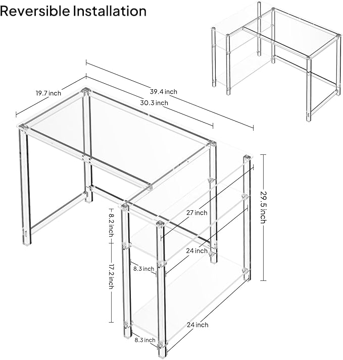 - Ample Storage Space - With 2-tier storage shelves on the side, the clear desk offers spacious space to flexibly accommodate items of various sizes, such as computer cases, books, documents, and office supplies, keeping the tabletop organized.